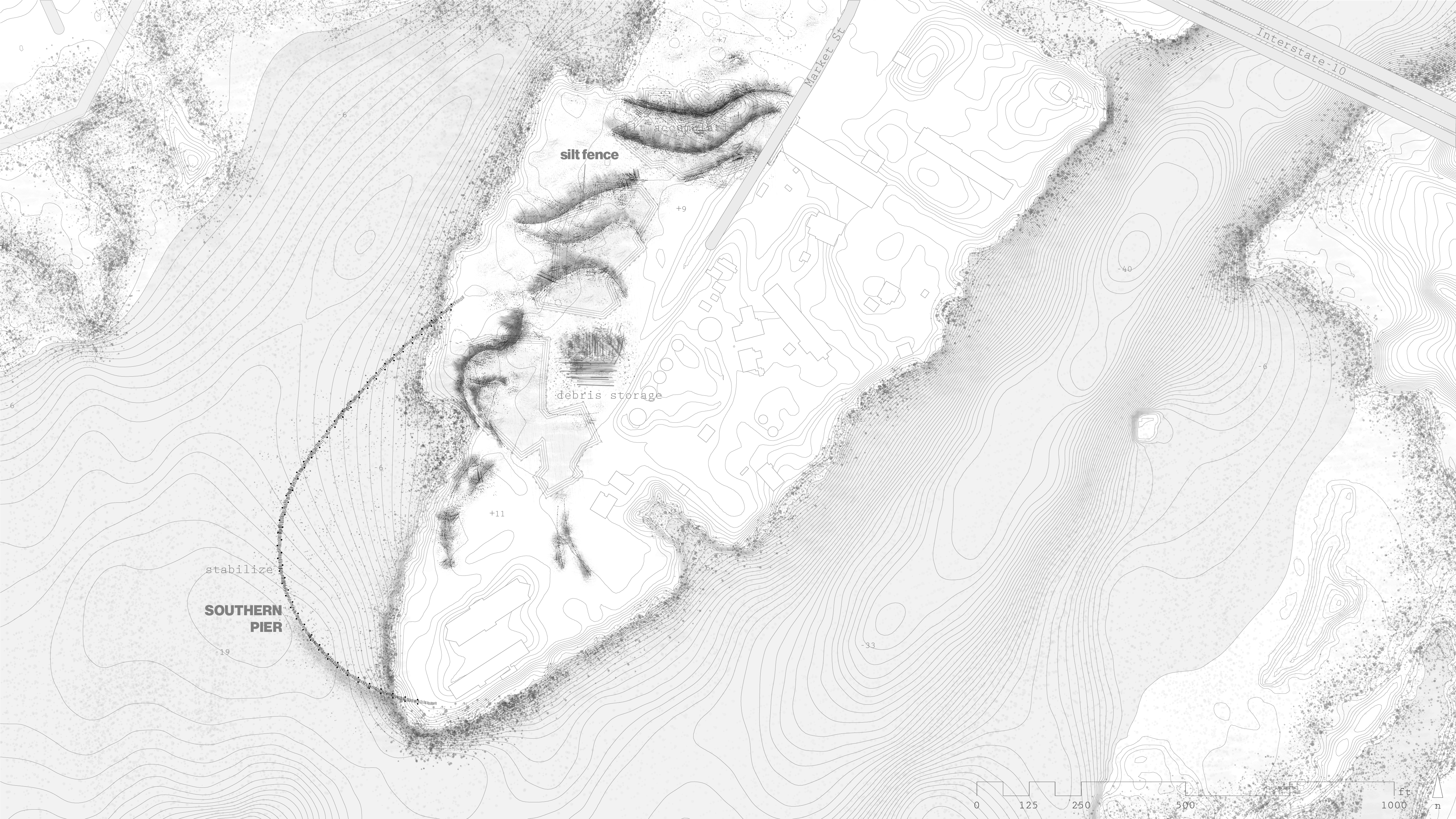 The power in gaining access to the deep river channel that you couldn’t reach before is embodied in Long Pier. The memories of the storms that have passed become visible as the piers are constructed over time. These piers hold memory, change, and materials of the hurricanes, as well as the lives of those that fish from them. These piers attempt to balance personal trauma with community construction as an act of shared memory.